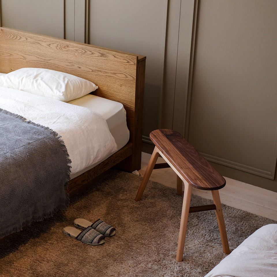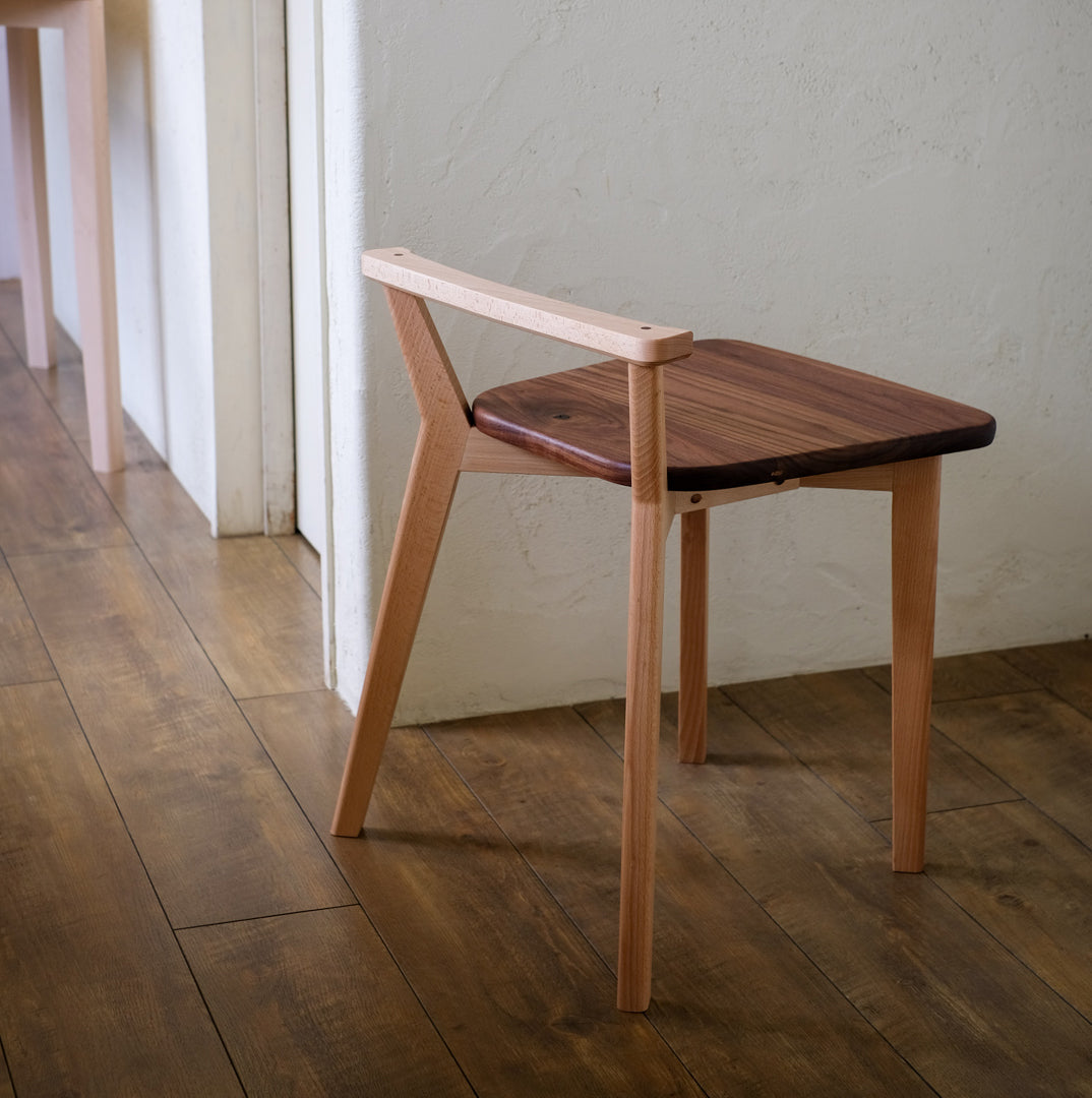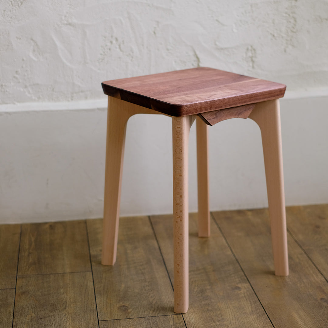 このソノスツールは、シンプルなデザインながらもどこか懐かしさを感じてもらえるそんなスツールにしたくデザインしました。全体の骨格を強調させるため、座面は角面で輪郭を強調しながらも、小口をテーパーにしてスッキリとしたフォルムに。材の質量を感じさせないスタイリッシュなデザインに仕上げました。