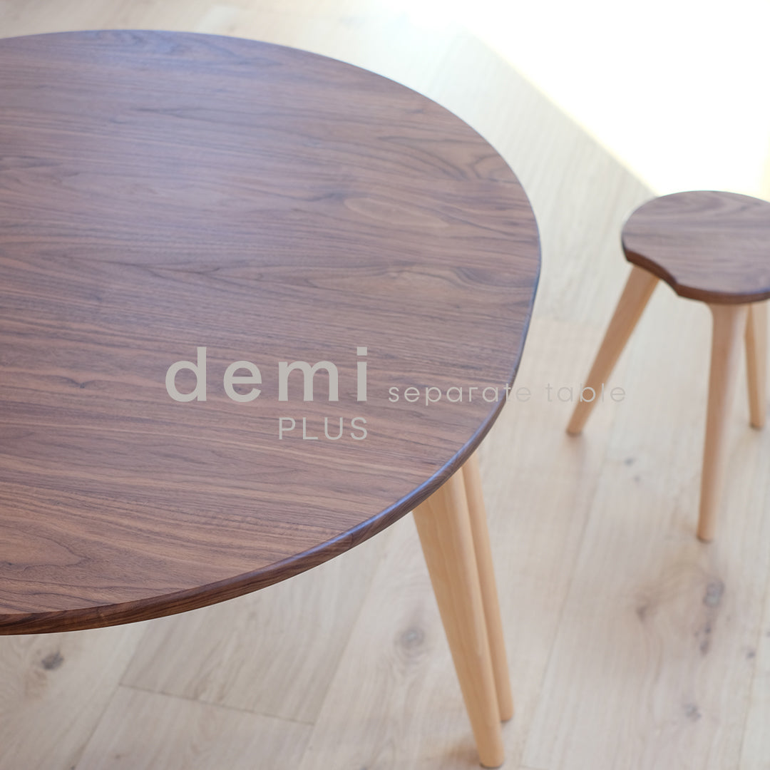ブラックウォールナットの方杖がひときわ際立つそんな丸いテーブルに。ビーチ材とのコントラストがあるからこそのデザインになっていると思います。スタンディングでも使用できるそんなラウンドテーブルです。
